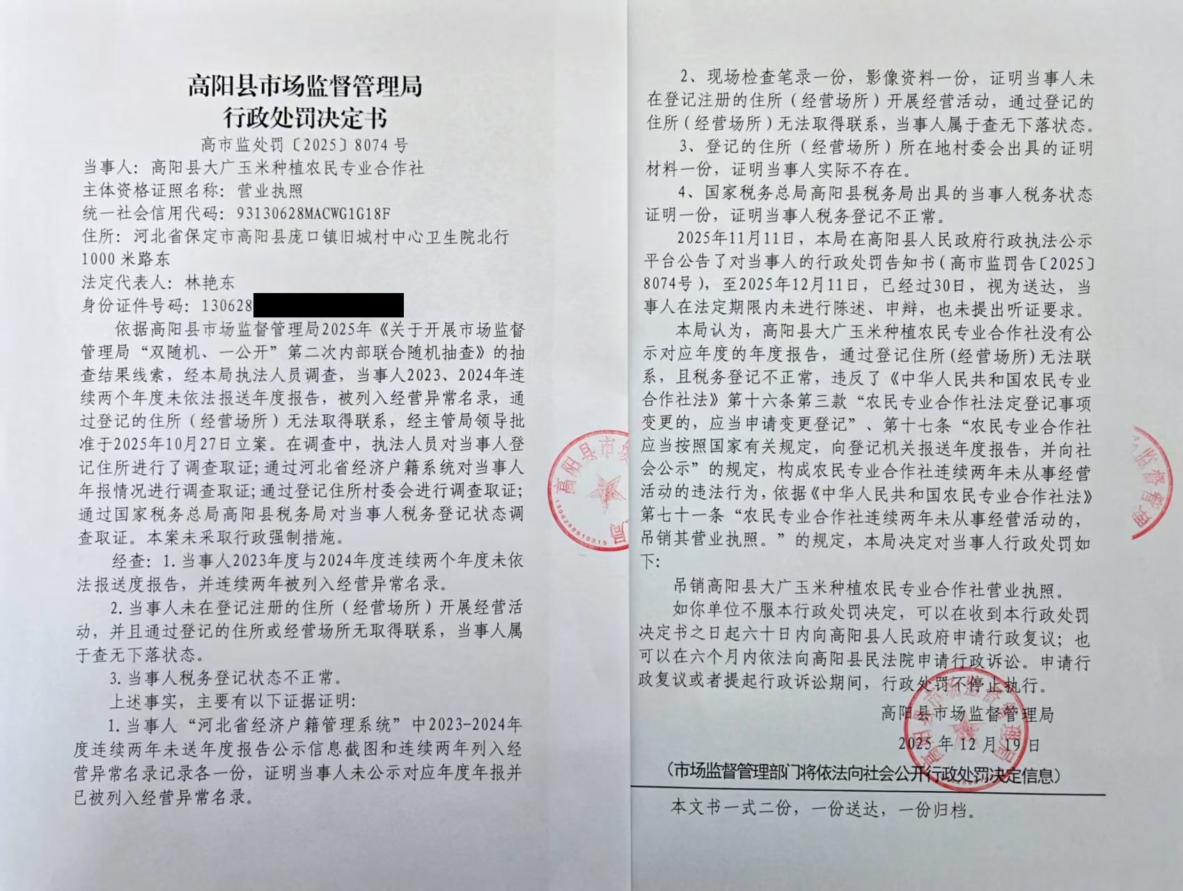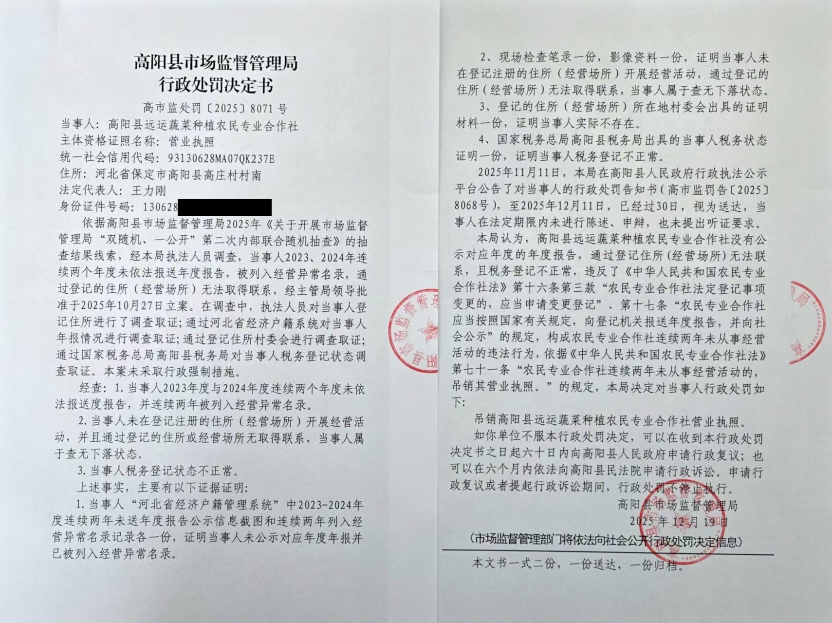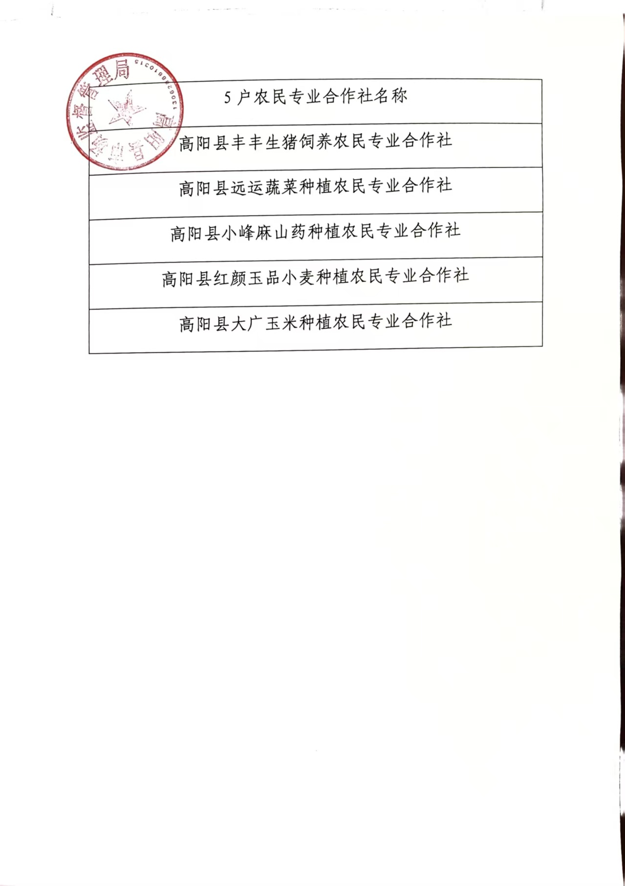 关于吊销高阳县丰丰生猪饲养农民专业合作社等5户农民专业合作社营业执照 行政处罚决定的公告