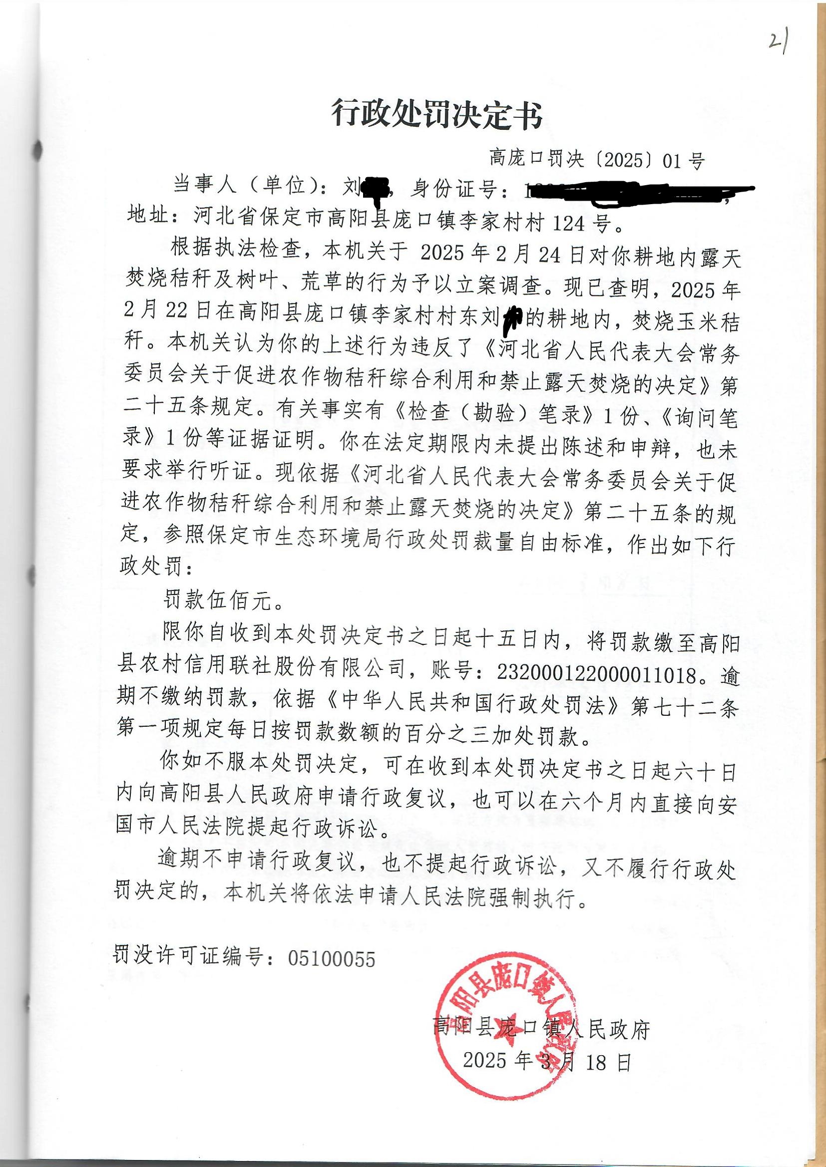 高阳县庞口镇刘某某露天焚烧秸秆案