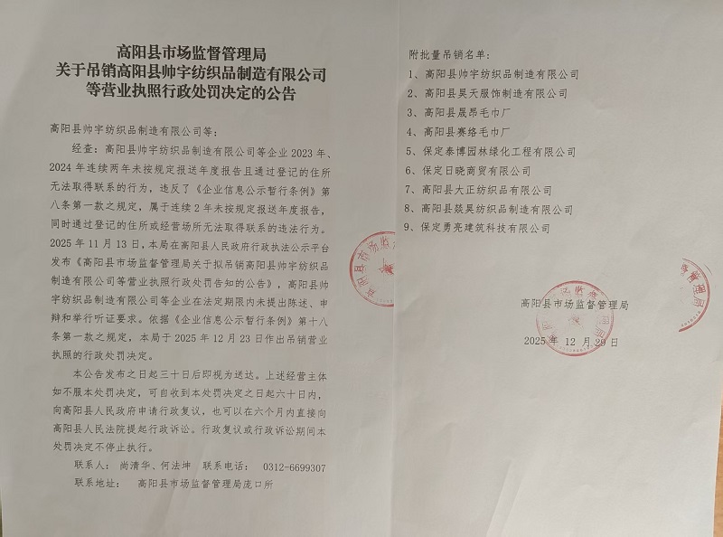 关于吊销高阳县帅宇纺织品制造有限公司等营业执照行政处罚决定的公告