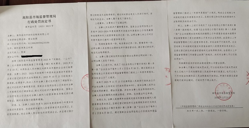 高阳县帅宇纺织品制造有限公司连续两年未按规定报送年度报告且通过登记的住所无法取得联系案