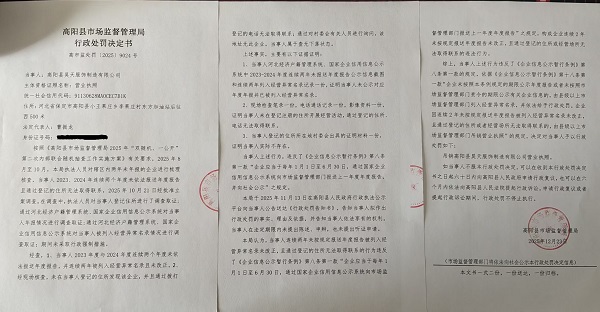 高阳县昊天服饰制造有限公司连续两年未按规定报送年度报告且通过登记的住所无法取得联系案