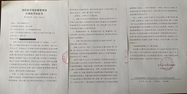 高阳县赛络毛巾厂连续两年未按规定报送年度报告且通过登记的住所无法取得联系案