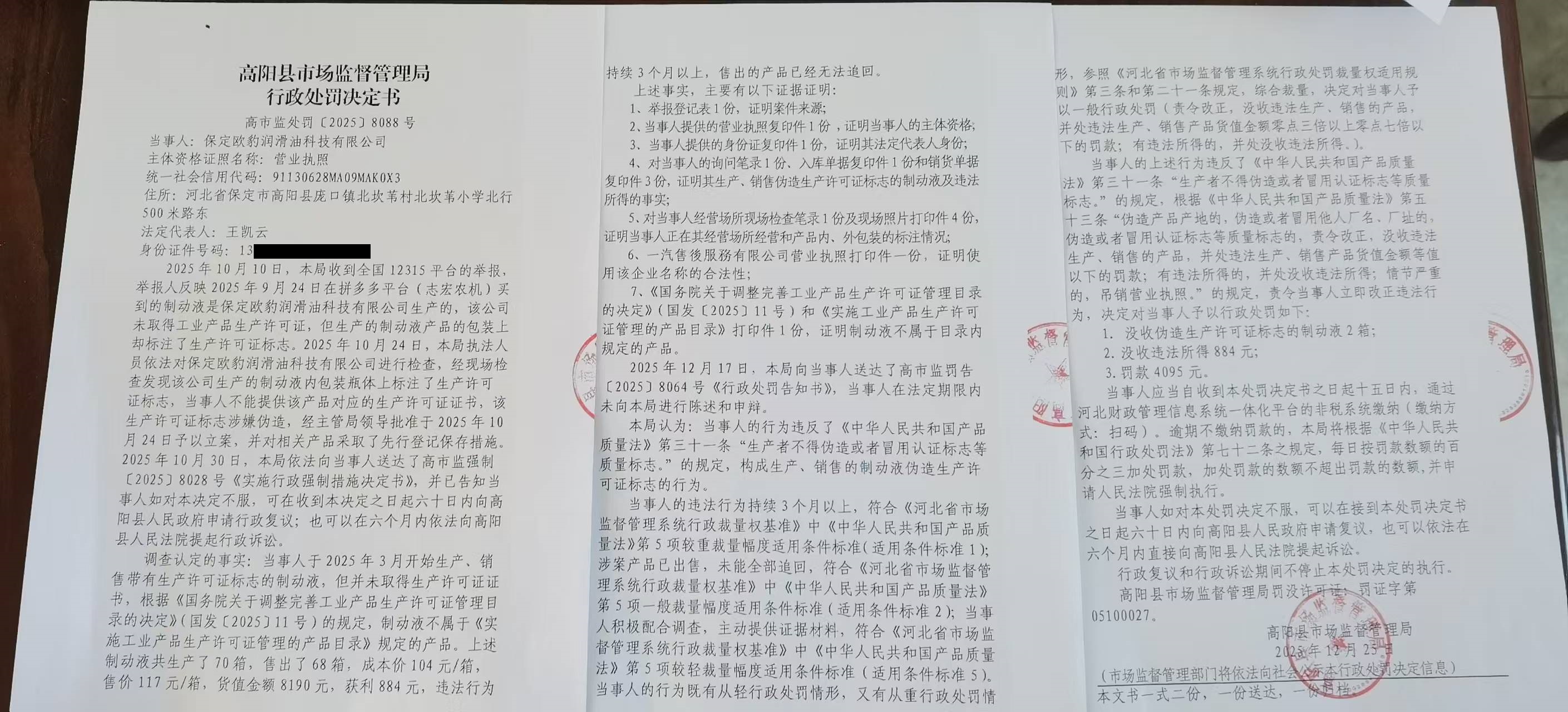 保定欧豹润滑油科技有限公司生产、销售的制动液伪造生产许可证标志案