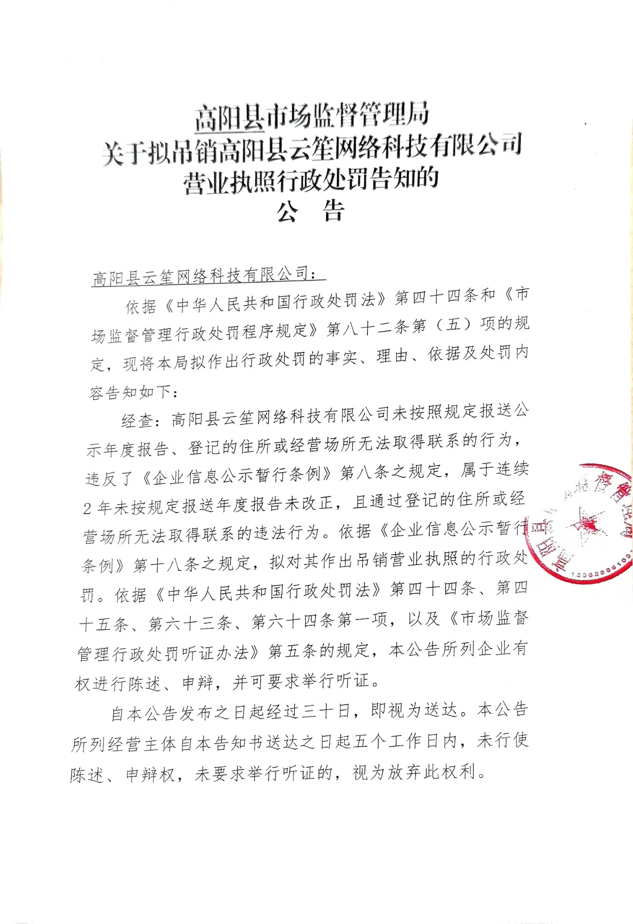 高阳县市场监督管理局关于拟吊销高阳县云笙网络科技有限公司营业执照行政处罚告知的公告