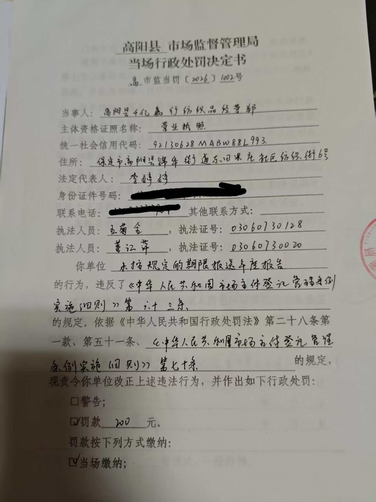 高阳县千亿嘉行纺织品经营部未按规定的期限报送年度报告案