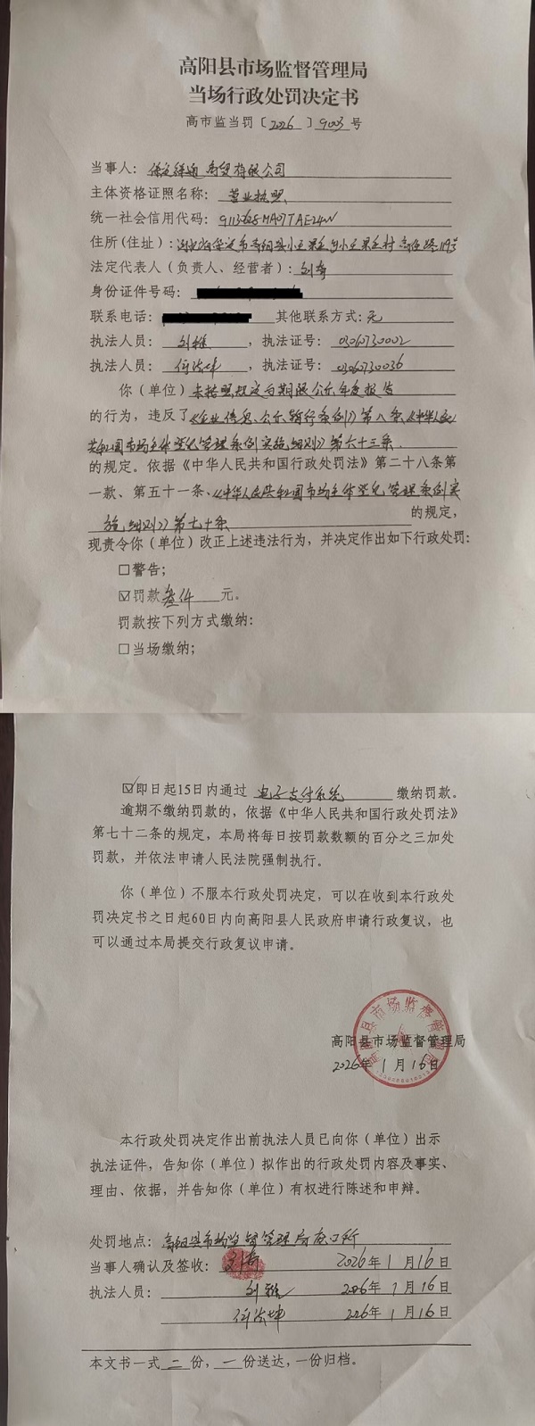 保定祥通商贸有限公司未按规定的期限公示年度报告案