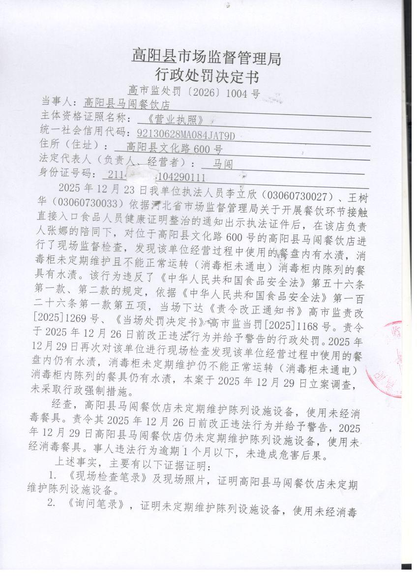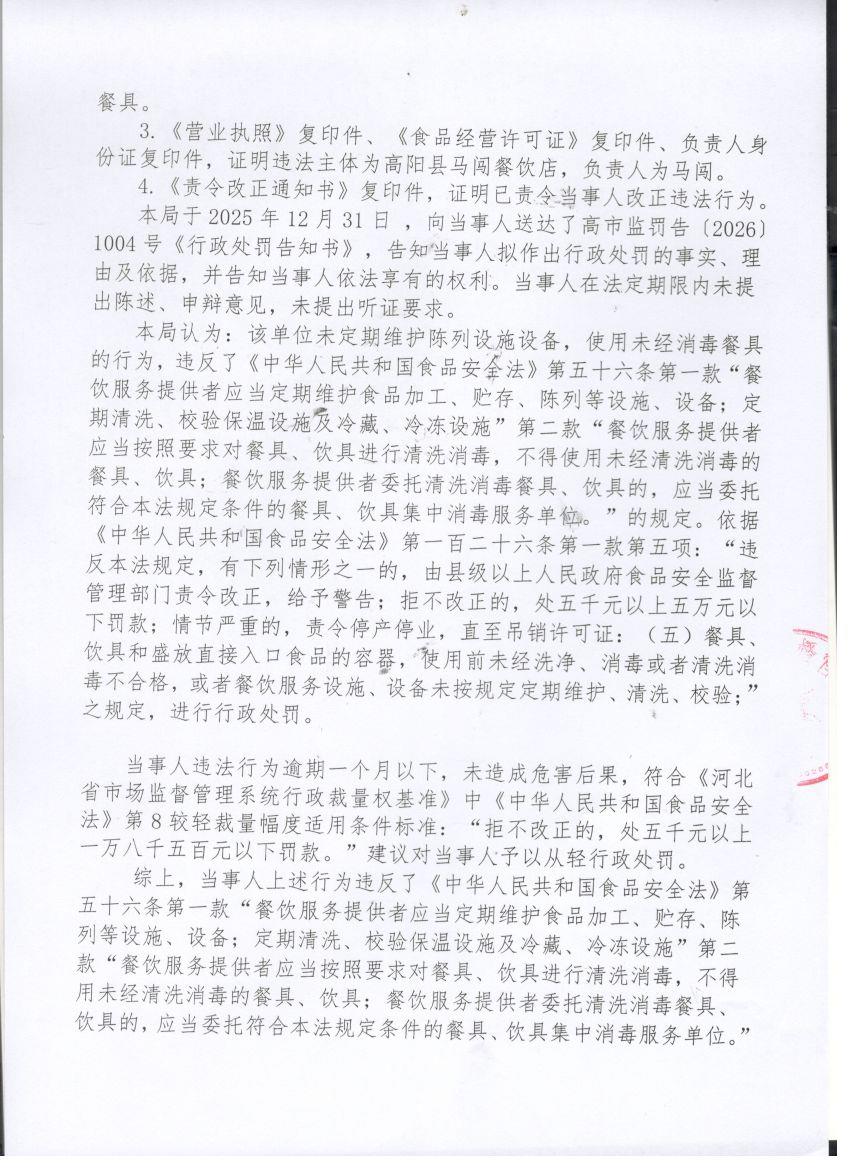 高阳县马闯餐饮店涉嫌未定期维护陈列设施设备,使用未经消毒餐具案