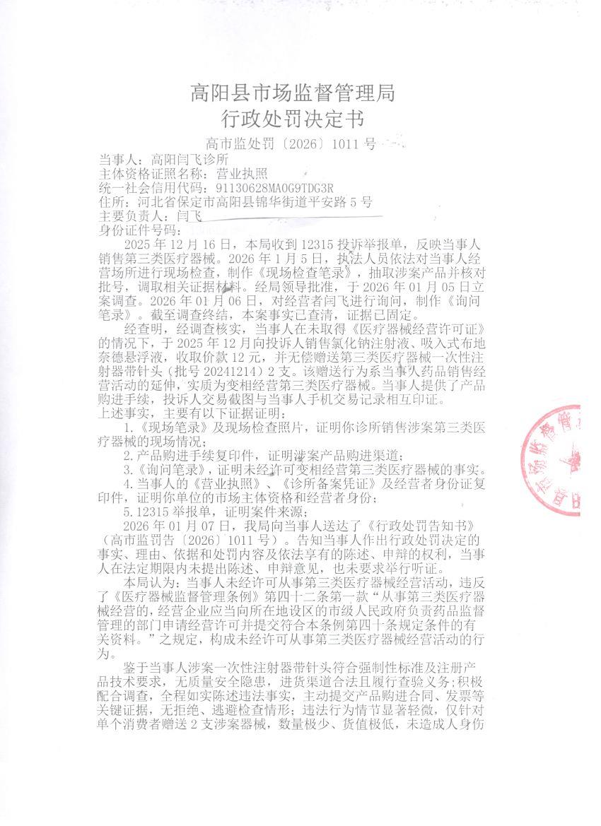 高阳闫飞诊所涉嫌未经许可从事第三类医疗器械经营活动案