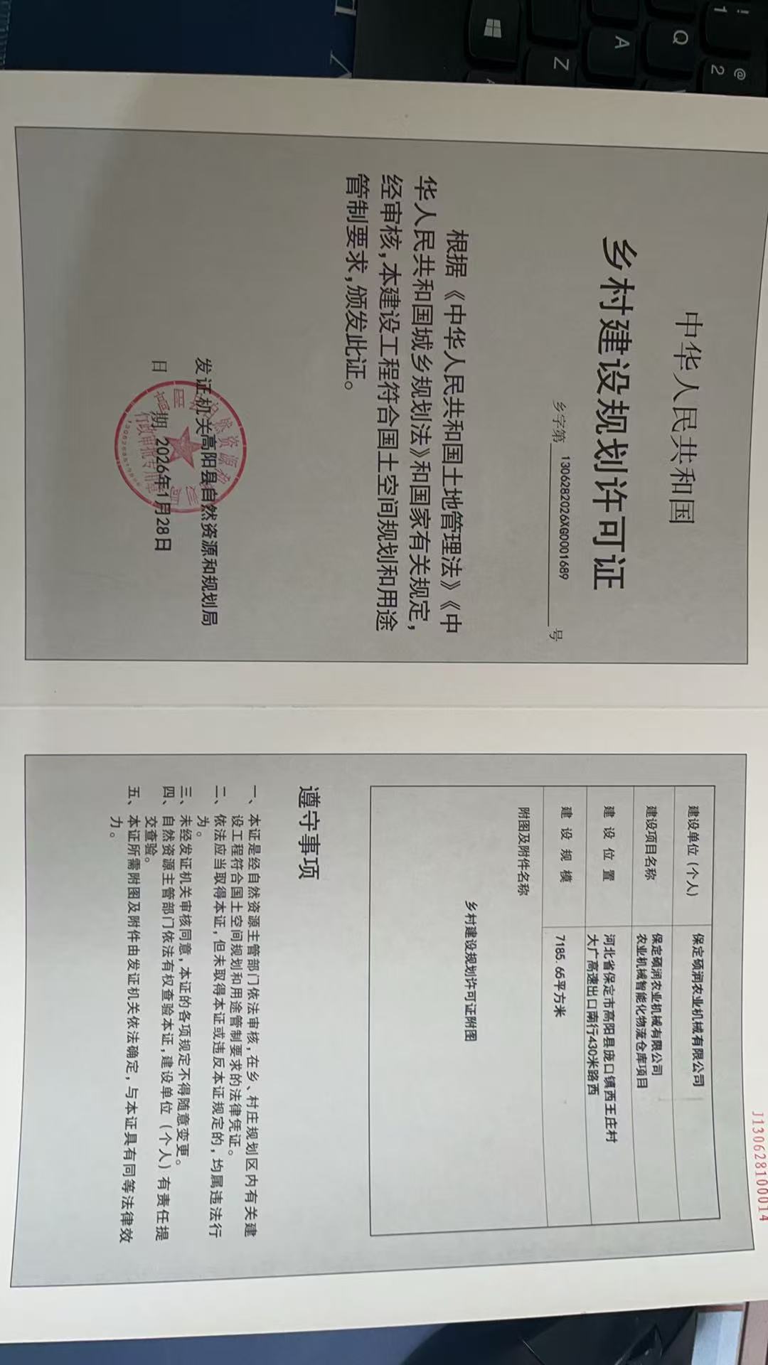 乡村建设规划许可证:保定硕润农业机械有限公司农业机械智能化物流仓库项目