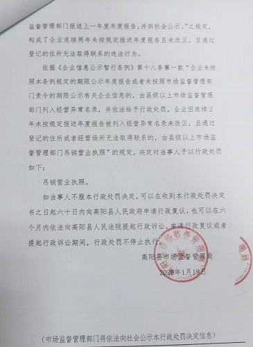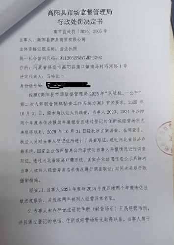 高阳县萨罗商贸有限公司连续两年未年报且通过登记的住所无法取得联系案