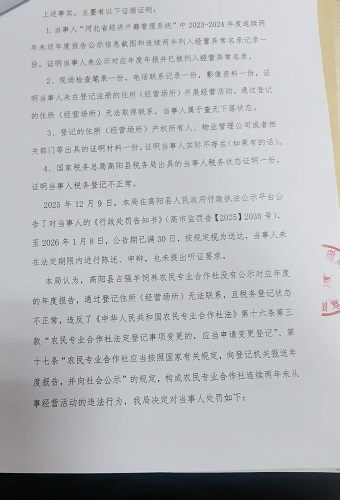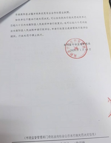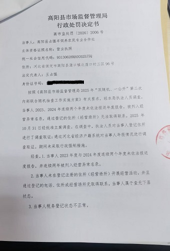 高阳县占强羊饲养农民专业合作社连续两年未从事经营活动案