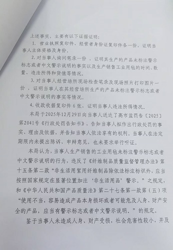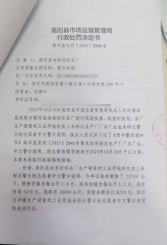 高阳县尚承纺织品厂生产销售的产品未标注警示标志或者中文警示说明案