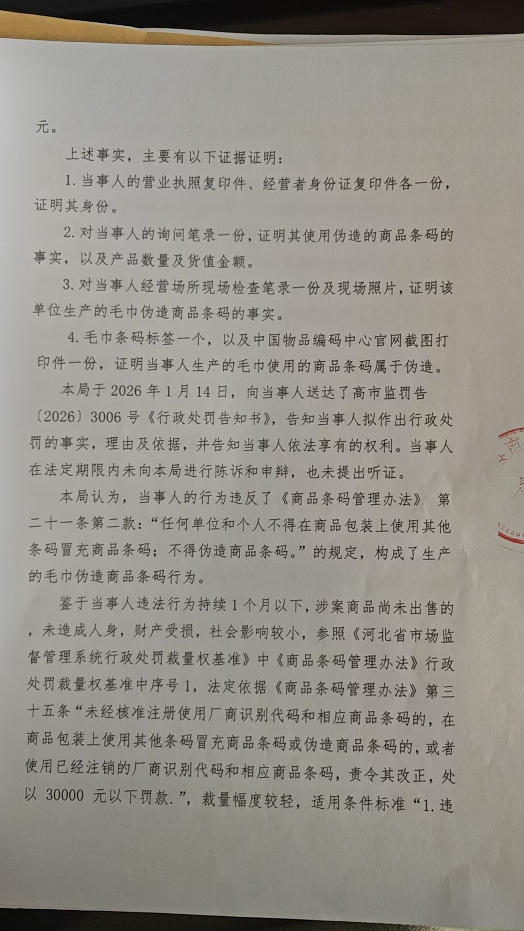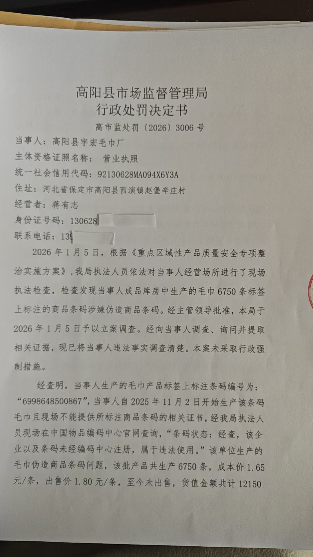 高阳县宇宏毛巾厂生产的毛巾伪造商品条码案