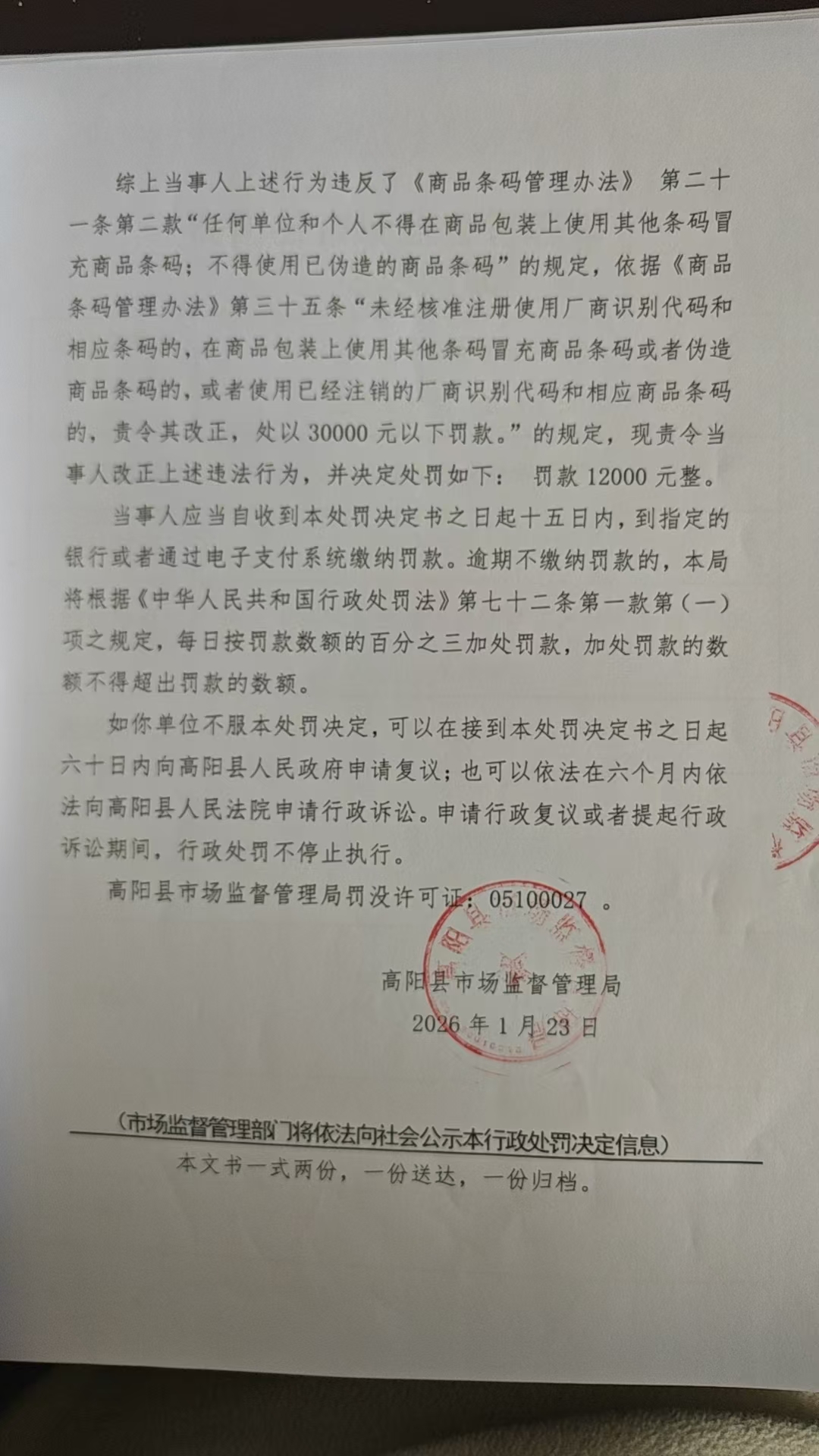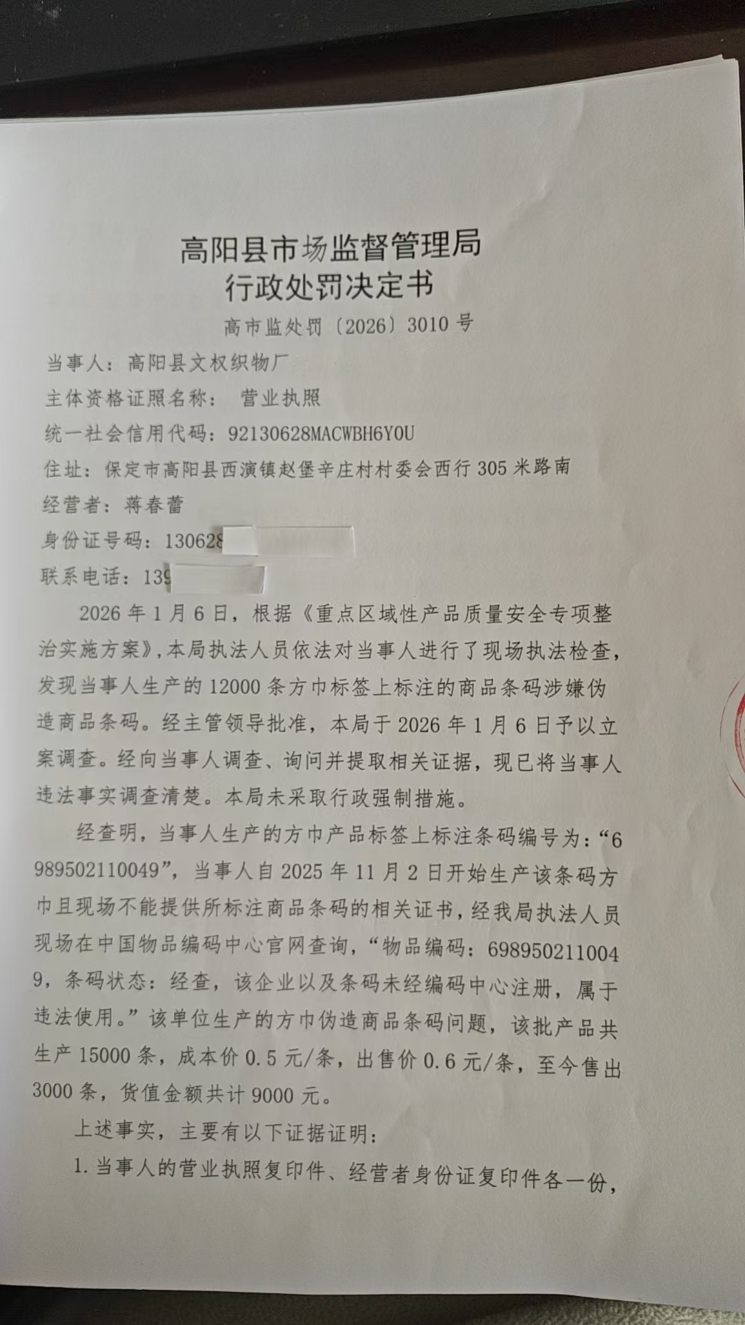 高阳县文权织物厂生产的方巾伪造商品条码案