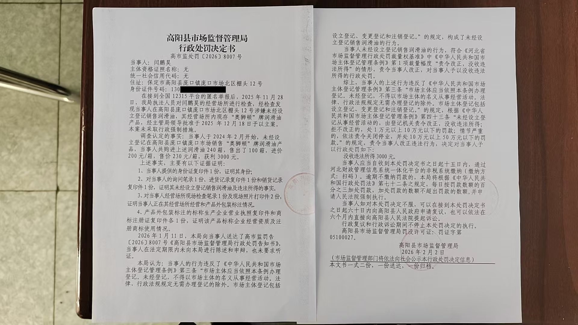 闫鹏昊未经设立登记销售润滑油案