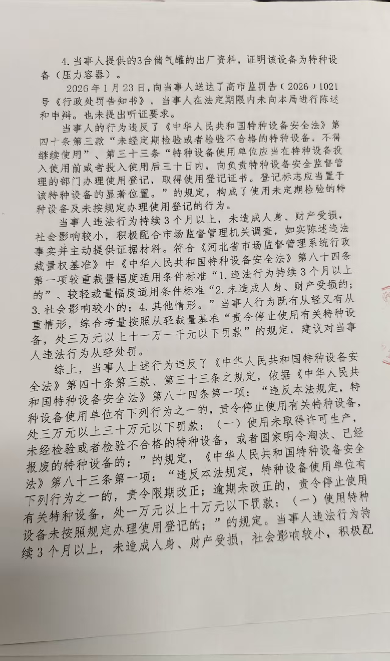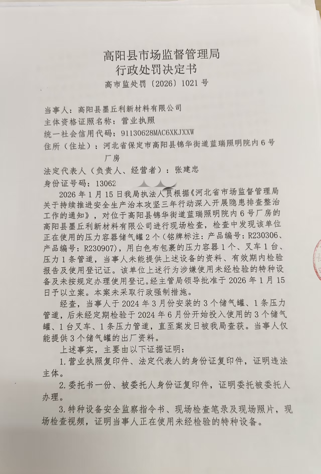 高阳县墨丘利新材料有限公司使用未经定期检验的特种设备及未办理使用登记证案
