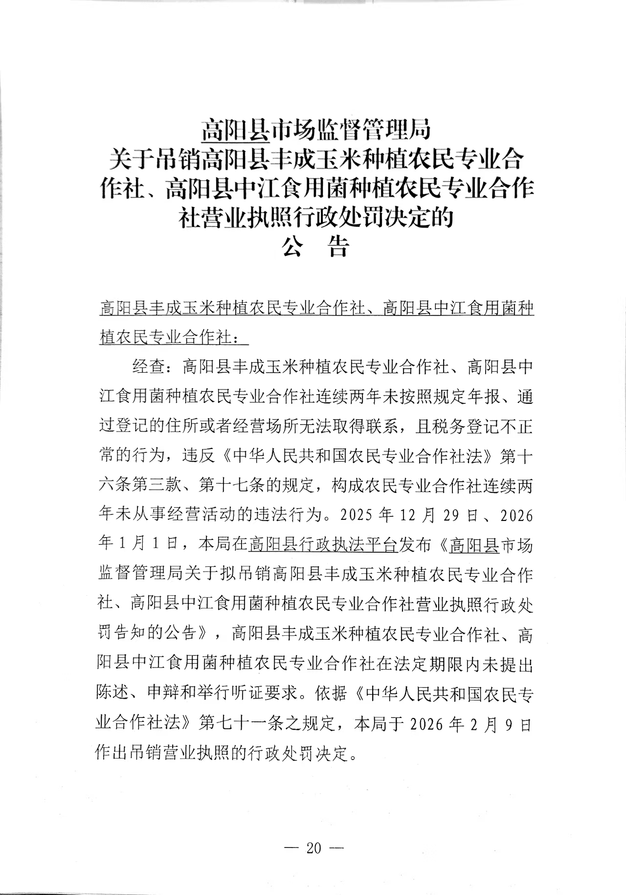 高阳县市场监督管理局关于高阳县丰成玉米种植农业合作社、高阳县中江食用菌种植农民专业合作社营业执照行政处罚决定的公告