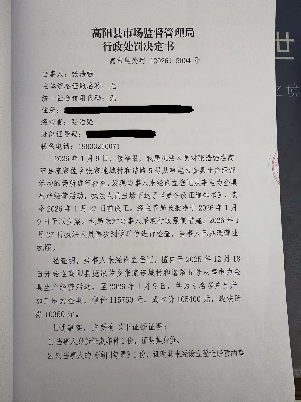 张浩强未经设立登记从事家具生产经营活动案