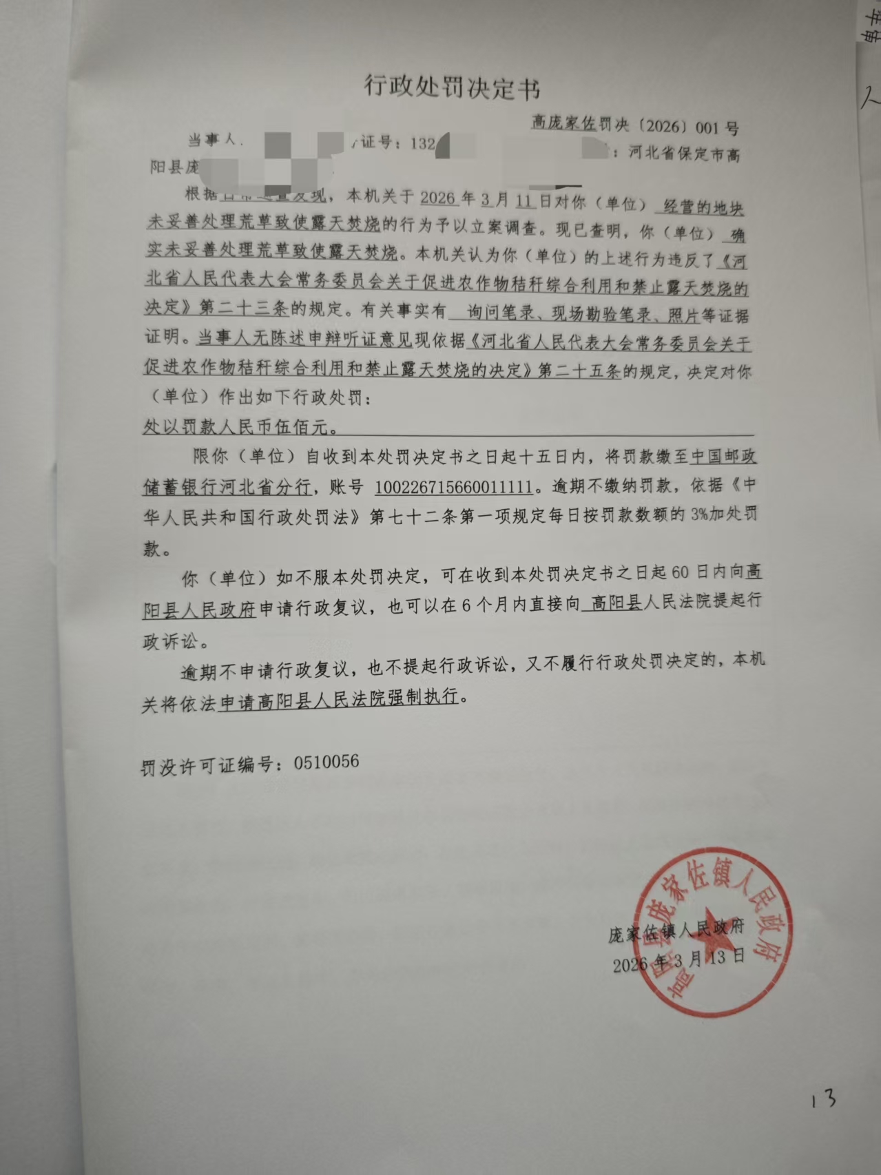 高庞家佐罚决{2026}001号