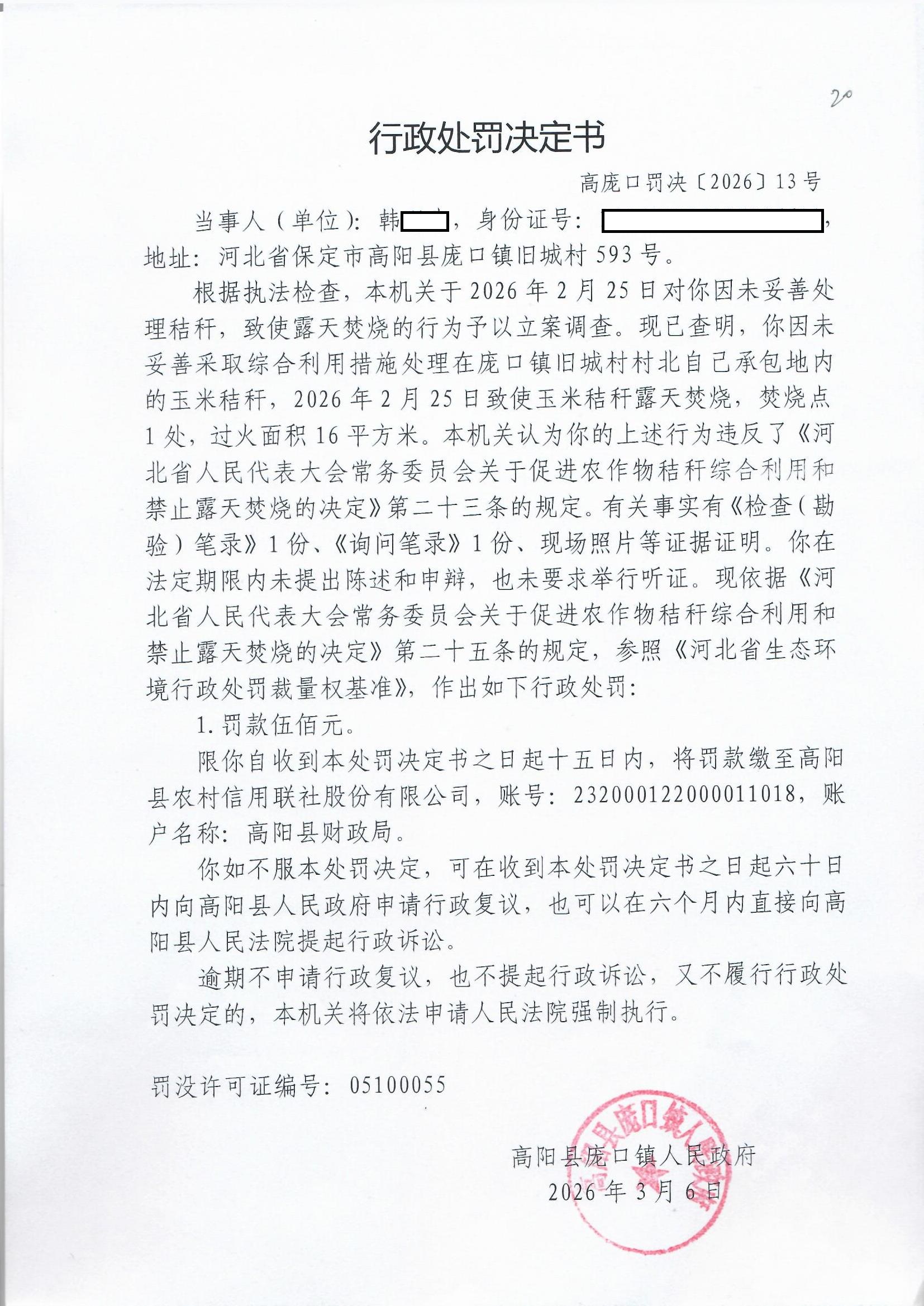 庞口镇韩某某未妥善处理秸秆致使露天焚烧案