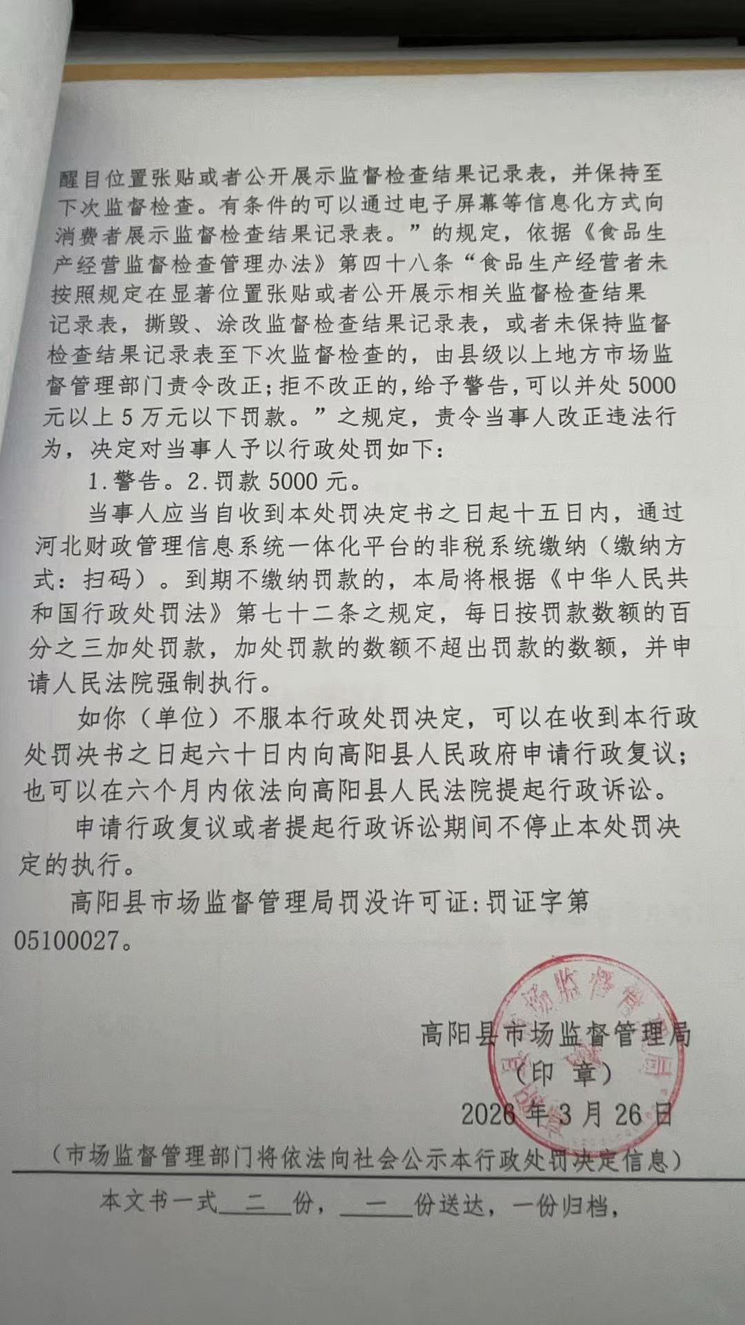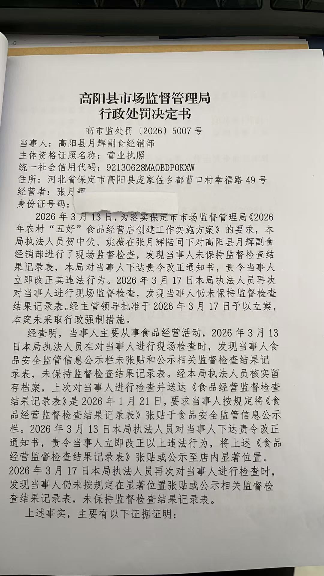 高阳县月辉副食经销部未保持监督检查结果记录表案