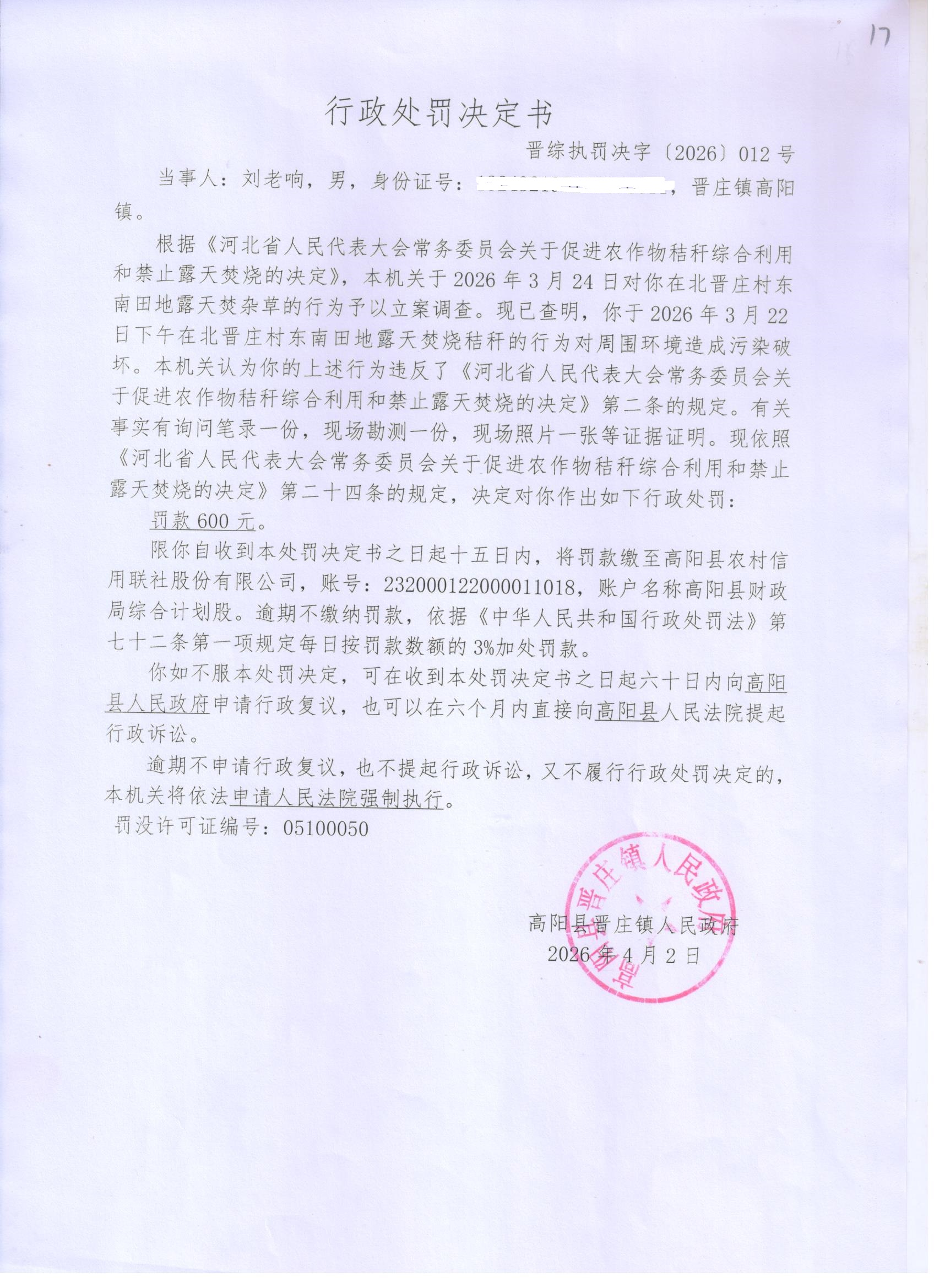 晋综执罚决字【2026】012号