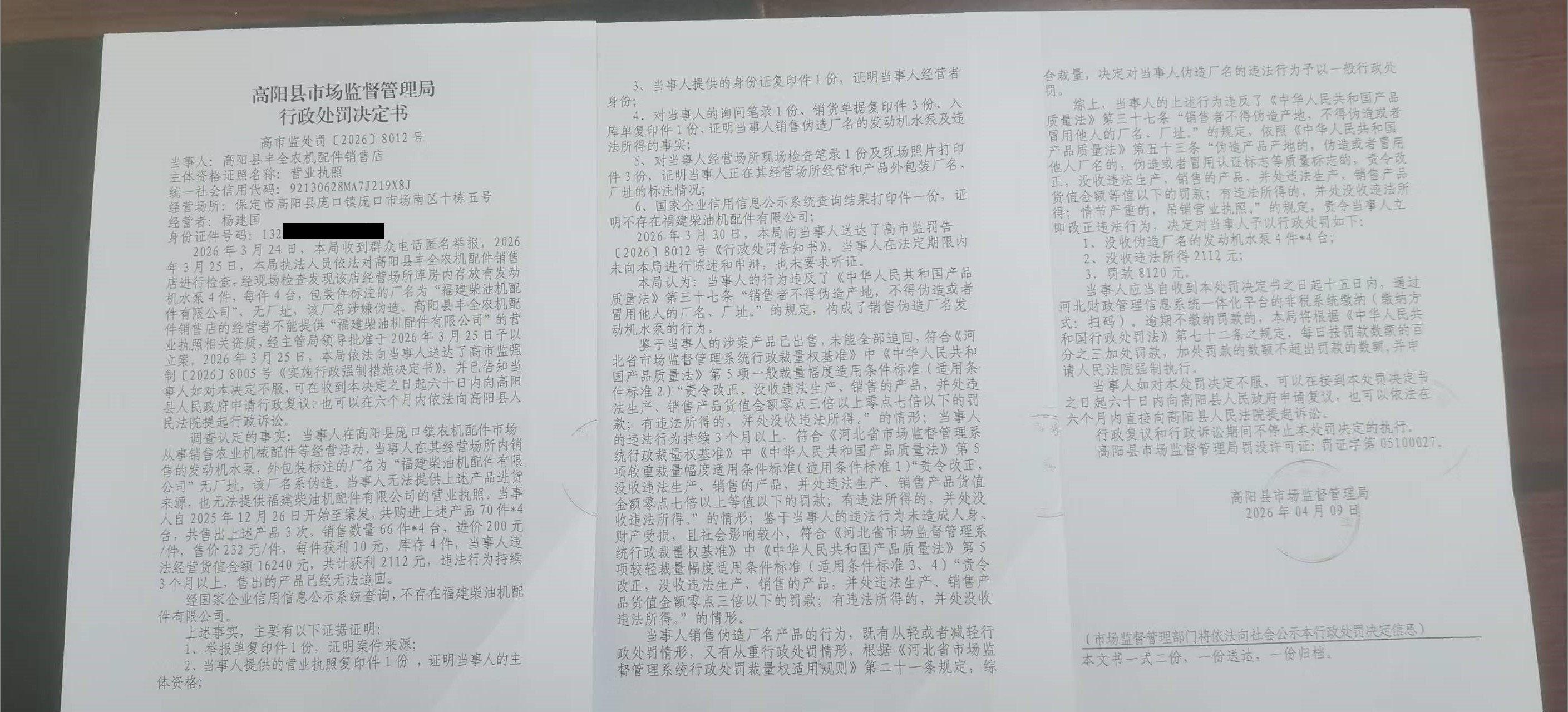 高阳县丰全农机配件销售店销售伪造厂名的发动机水泵案