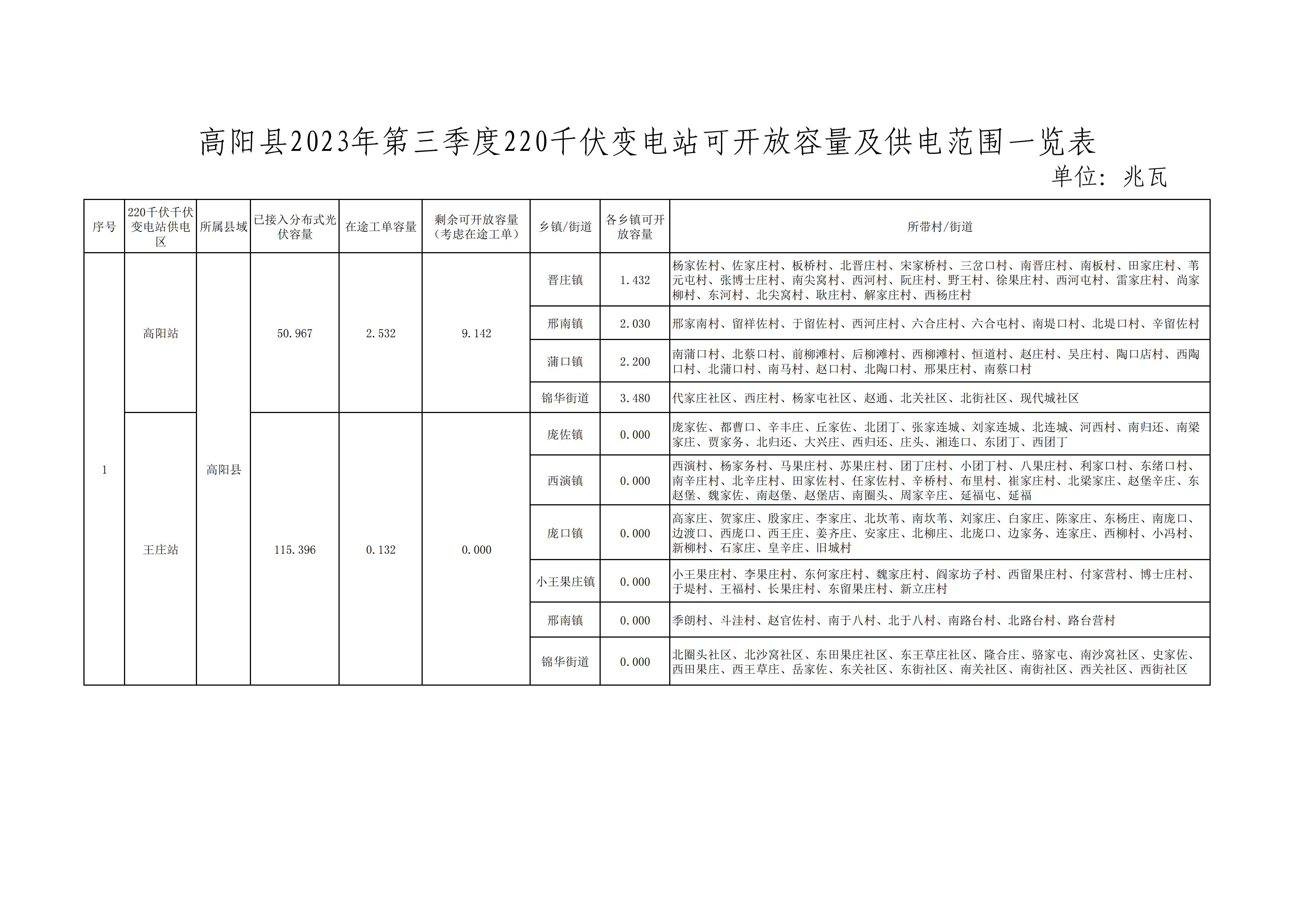 附件:高阳县2023年第三季度220千伏变电站可开放容量及供电范围一览表