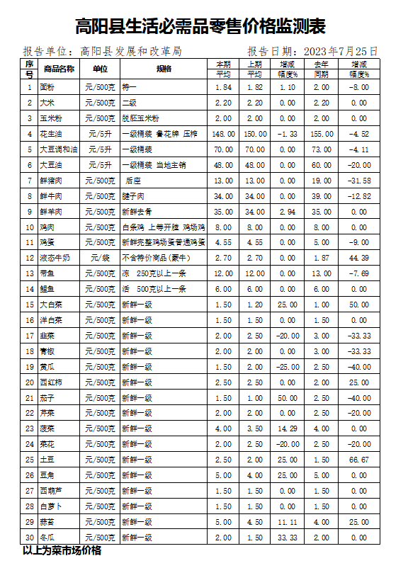 高阳县最新生活必需品零售价格监测表发布!