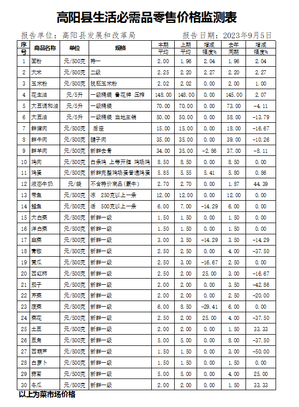 高阳县最新生活必需品零售价格监测表发布