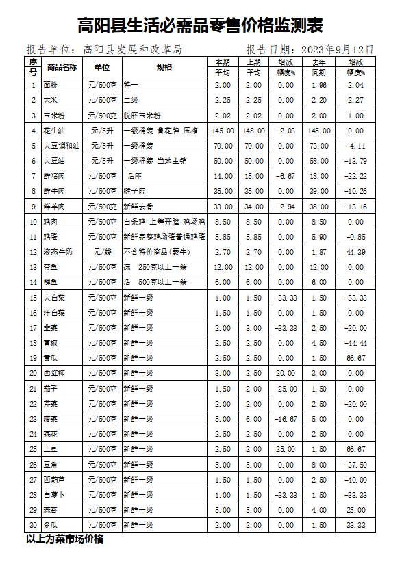 高阳县最新生活必需品零售价格监测表发布