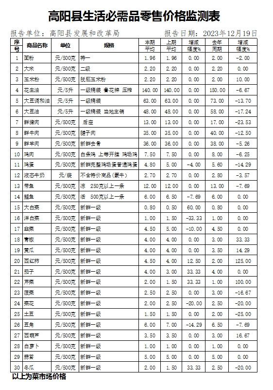 高阳县最新生活必需品零售价格监测表发布