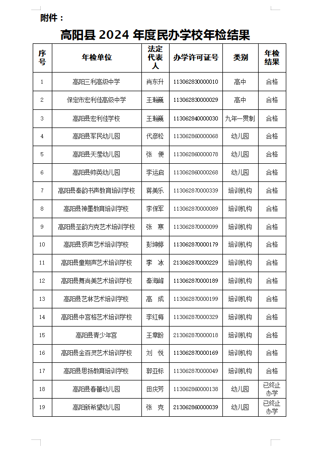 为进一步加强民办学校管理,促进民办学校规范办学,推动我县民办教育全面健康发展,根据《中华人民共和国民办教育促进法》相关要求,按照保定市教育局《关于开展2024年度民办学校检查工作的通知》(保教发〔2025〕5号)的安排,我局采取民办学校自查自评和年检工作小组实地检查的形式对全县民办学校(幼儿园)、非学科类校外培训机构进行了年检,现将年检结果予以公告(年检结果见附件):
