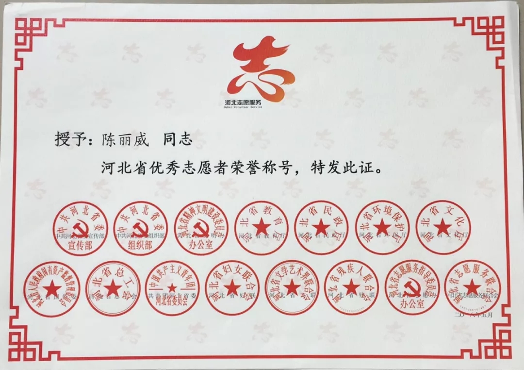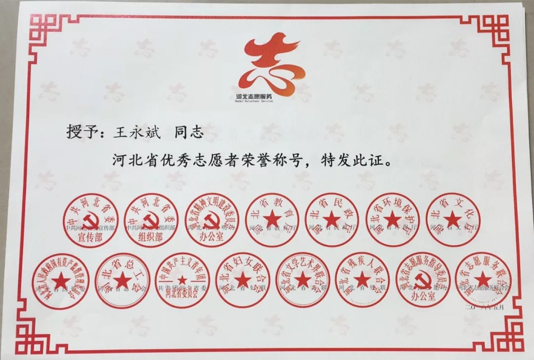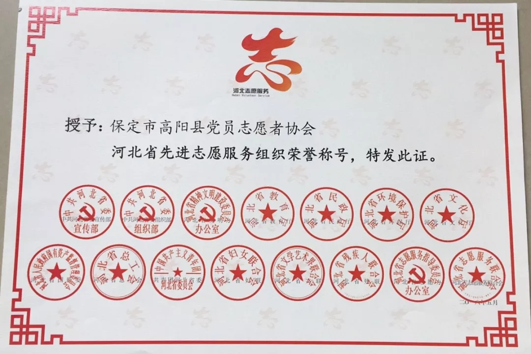 经省委宣传部、省委组织部、省文明办、省教育厅、省民政厅、省环保厅、省文化厅、省国资委、省总工会、团省委、省妇联、省文联、省残联、省志愿办、省志愿服务联合会同意,我县陈丽威、王永斌两名志愿者被推选为“河北省优秀志愿者”。保定市高阳县党员志愿者协会一个志愿服务组织被推选为“河北省先进志愿服务组织”。