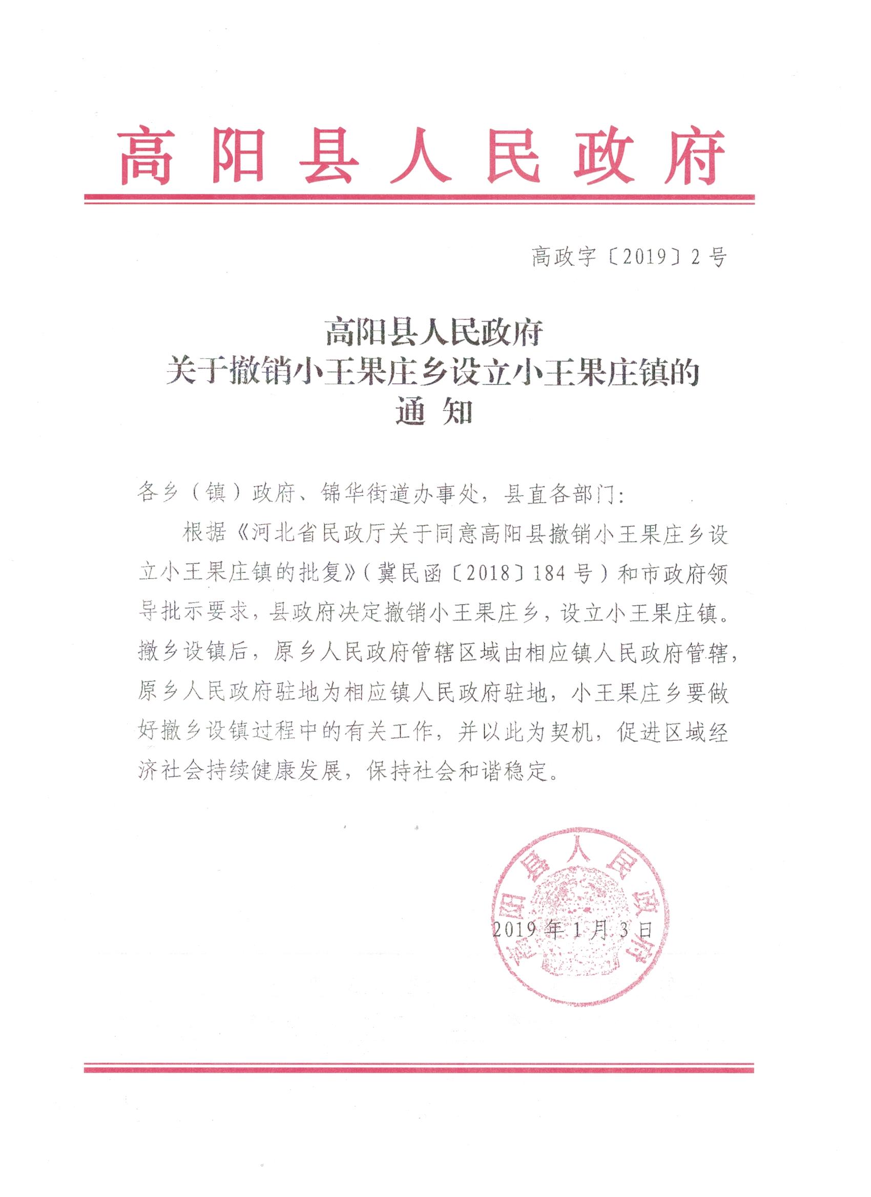 高阳县人民政府关于撤销小王果庄乡设立小王果庄镇的通知