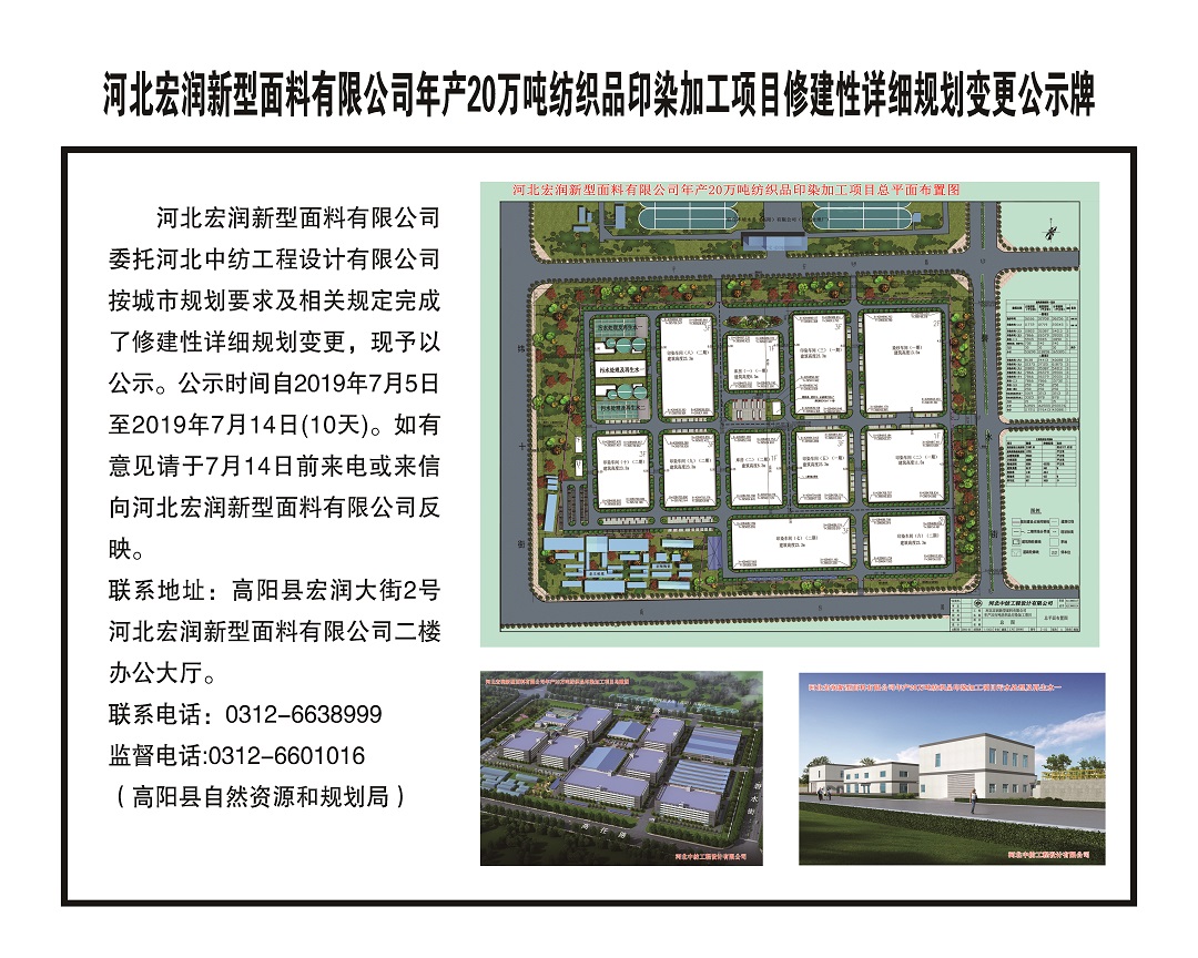 河北宏润新型面料有限公司年产20万吨纺织品印染加工项目修建性详细规划变更公示牌
