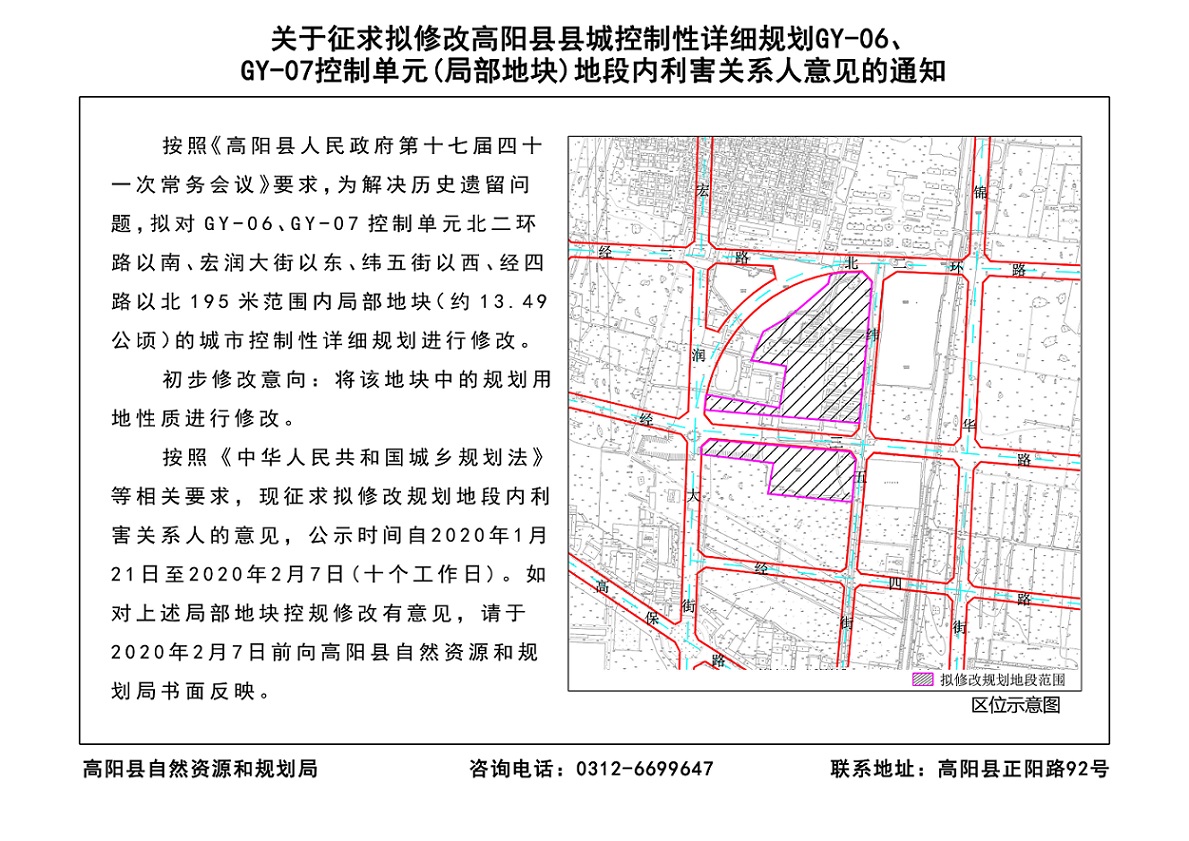 关于征求拟修改高阳县县城控制性详细规划GY一06、GY一07控制单元(局部地块)地段内利害关系人意见的通知