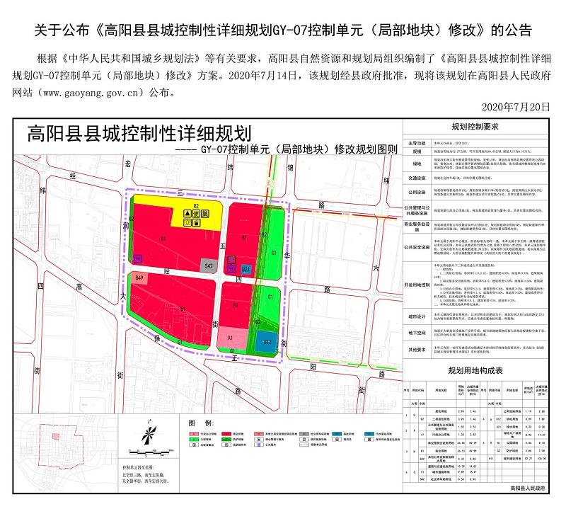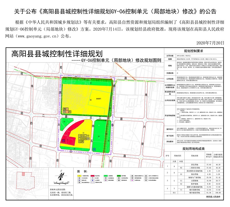 关于高阳县县城控制性详细规划GY-06、GY-07控制单元(局部地块)修改的公告