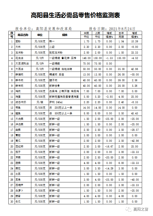 高阳县最新生活必需品零售价格监测表发布