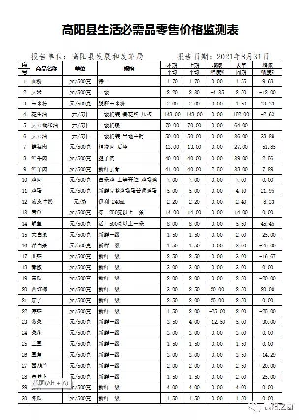 高阳县最新生活必需品零售价格监测表发布