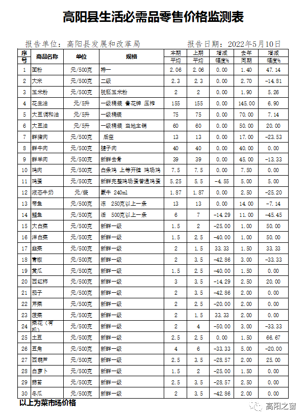 高阳县最新生活必需品零售价格监测表发布