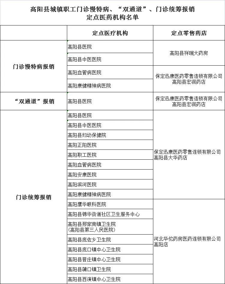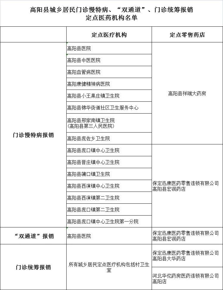 高阳县门诊慢特病、“双通道”、门诊统筹报销定点医药机构名单