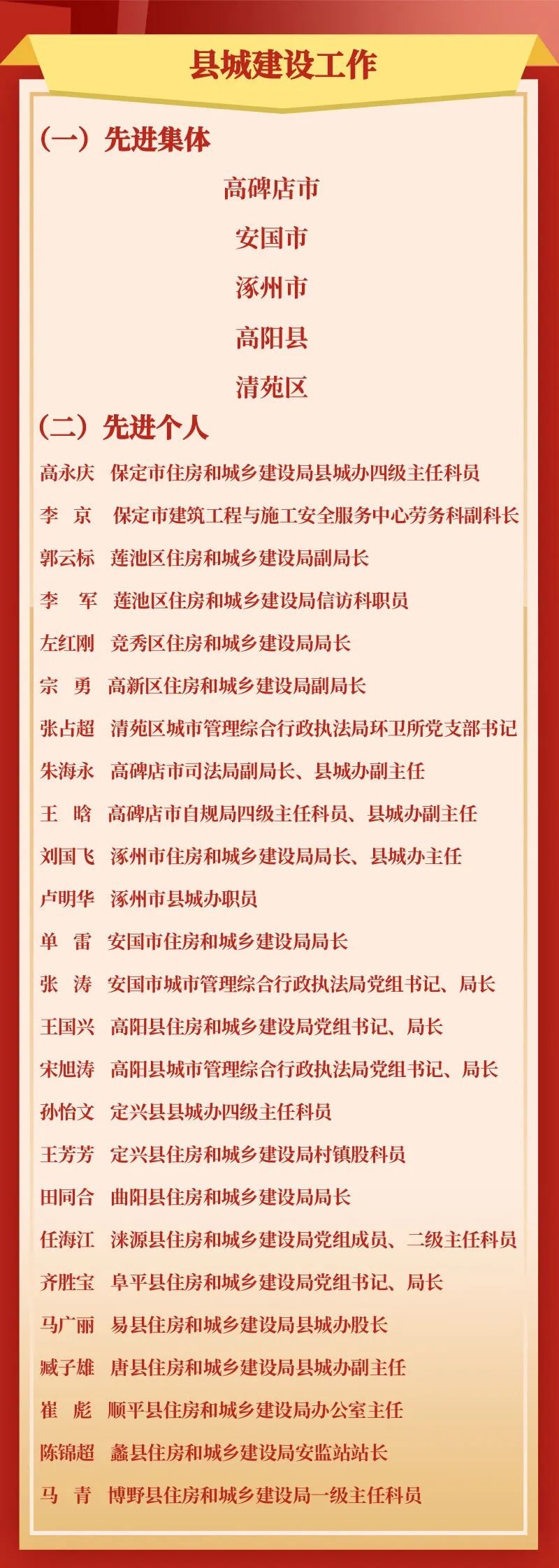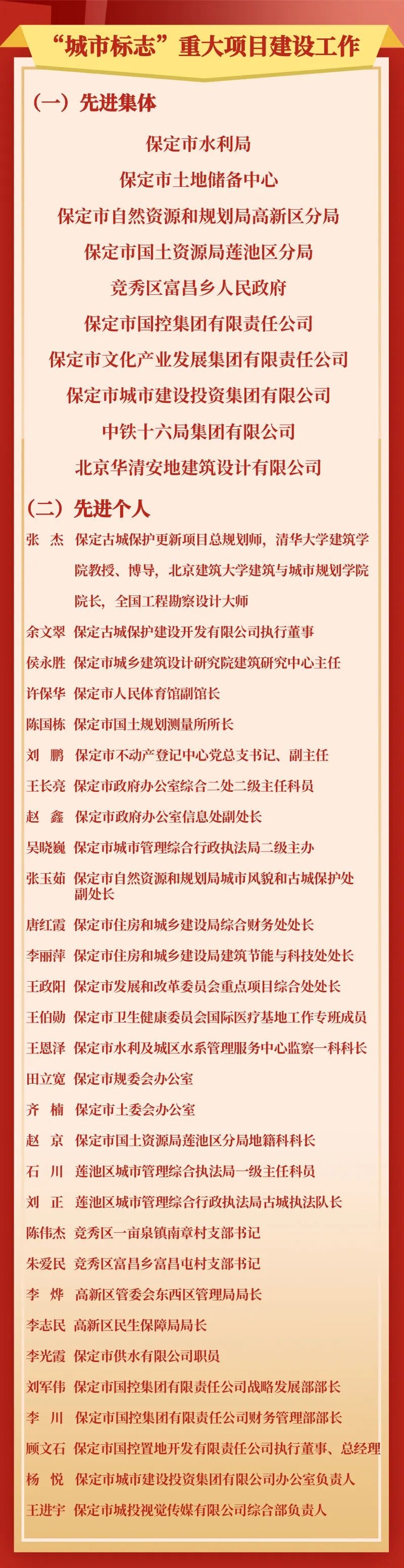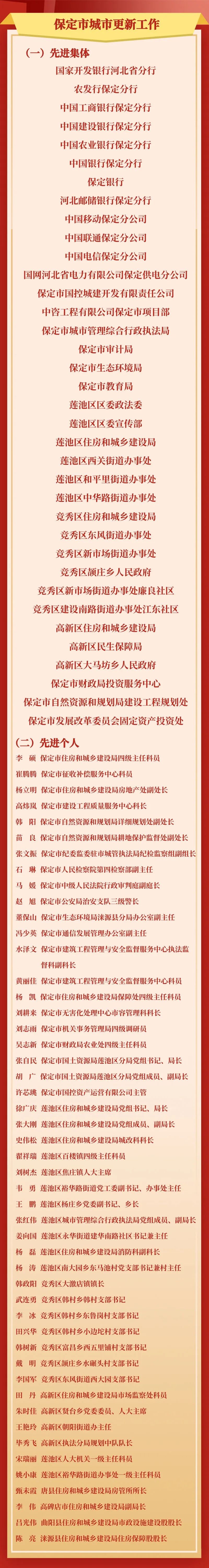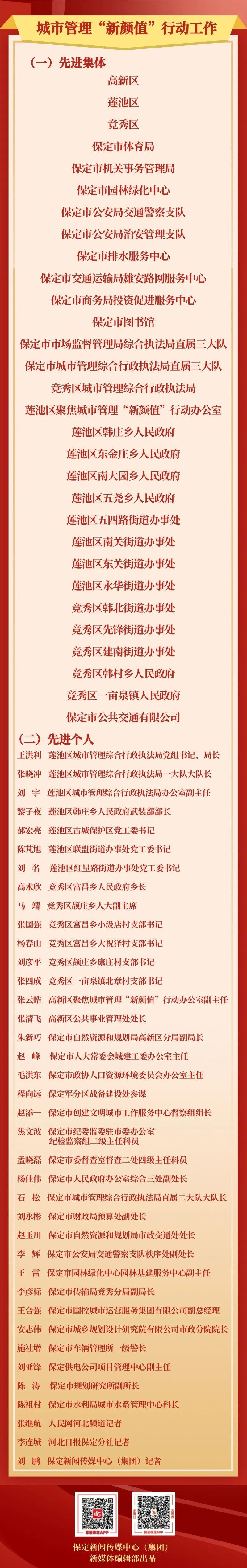 一年来,全市各级党员干部群众积极投身现代化品质生活之城建设的火热实践,城市品质蝶变跃升,节节攀高。保定历史上最大规模的城中村改造进展如火如荼,一期11个安置区已交付,二期20个安置区全部封顶,三期21个安置区建设全面启动,让百姓住上好房子的庄严承诺正在加速兑现。改造老旧小区618个、惠及居民11万户,打造东风路、朝阳大街等“四化”样板路67条,综合整治提升背街小巷132条,新增停车位1.12万个,小切口惠及大民生,微更新实现大效果。持续开展聚焦城市管理“新颜值”行动,一体实施“拆改建管亮绿”,拆除各类违建临建379万平方米,取而代之的是159个口袋公园,96处运动场,城市的变化让群众获得感成色更足、幸福感更强。全市首个滨水绿道环城水系全线贯通,交付与民,“直隶第一街”西大街焕新重生,“保定之光”点亮古城,一批城市标志性工程加快建设。1014个项目助力县城承载力持续提升,美丽县城更加宜居,一座现代化品质生活新城正在厚积薄发、拔节成长。只有干出来的精彩,没有等出来的辉煌。一年来,各级各有关部门、驻保单位以及社会各界激情忘我、敢打必胜,涌现出一大批先进单位和模范典型,是建设高品质、有韧性的现代化新保定的中流砥柱。为进一步动员和激励全市上下不忘初心担使命,矢志不渝向前行,只争朝夕、永不懈怠,市委、市政府决定,对在全市城市“新颜值”建设中作出突出贡献的先进集体和先进个人进行表彰。